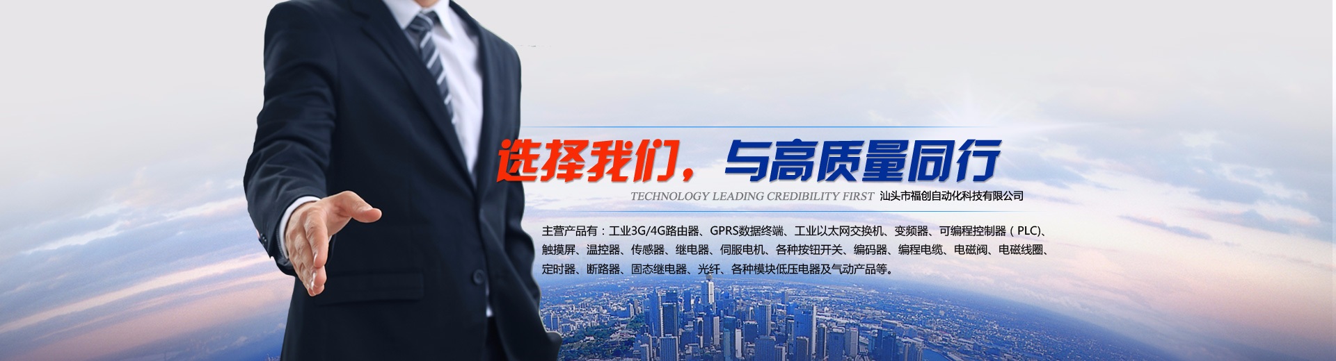 汕頭市福創(chuàng)自動化科技有限公司是一家集自動化元件的代理銷售與維修、自動化設備設計制造、自動化工程安裝改造、機電工程安裝改造、自動化機械設備設計與制造的企業。 主營產品有:工業3G/4G路由器、GPRS數據終端、工業以太網交換機、變頻器、可編程控制器(PLC)、觸摸屏、溫控器、傳感器、繼電器、伺服電機、各種按鈕開關、編碼器、編程電纜、電磁閥、電磁線圈、定時器、斷路器、固態(tài)繼電器、光纖、各種模塊低壓電器及氣動產品等。